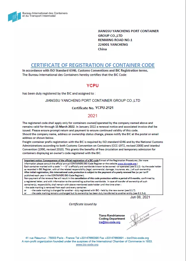 6月10日,從國(guó)際集裝箱局(法國(guó))傳來喜訊,鹽城港集團(tuán)自備的200只集裝箱,全部完成前綴YCPU的注冊(cè)登記手續(xù)(證書編號(hào):YCPU-2121),正式成為可以全球流通的集裝箱。自此,鹽城港自備箱在世界上有了自己的名字—“YCPU”,拿到了自己的“環(huán)球通行證”。