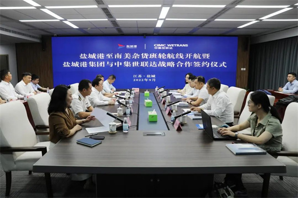 9月17日,鹽城港至南美雜貨班輪航線開航暨鹽城港集團(tuán)與中集世聯(lián)達(dá)戰(zhàn)略合作簽約儀式成功舉行。集團(tuán)黨委書記、董事長、總經(jīng)理周正雄主持活動。中集世聯(lián)達(dá)長江物流副總經(jīng)理劉羽,鹽城海關(guān)二級高級主辦李健,鹽城海關(guān)駐大豐港海關(guān)辦事處主任崔克勁,集團(tuán)總經(jīng)理助理孫永峰等參加并鑒簽。鹽城港港口公司董事長袁欣代表集團(tuán)與中集世聯(lián)達(dá)長江物流公司簽訂合作協(xié)議。