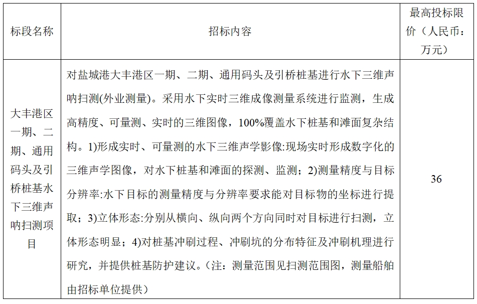 (5)項目標(biāo)段劃分:大豐港區(qū)一期、二期、通用碼頭及引橋樁基水下三維聲吶掃測項目共劃分1個標(biāo)段,標(biāo)段信息如下:
