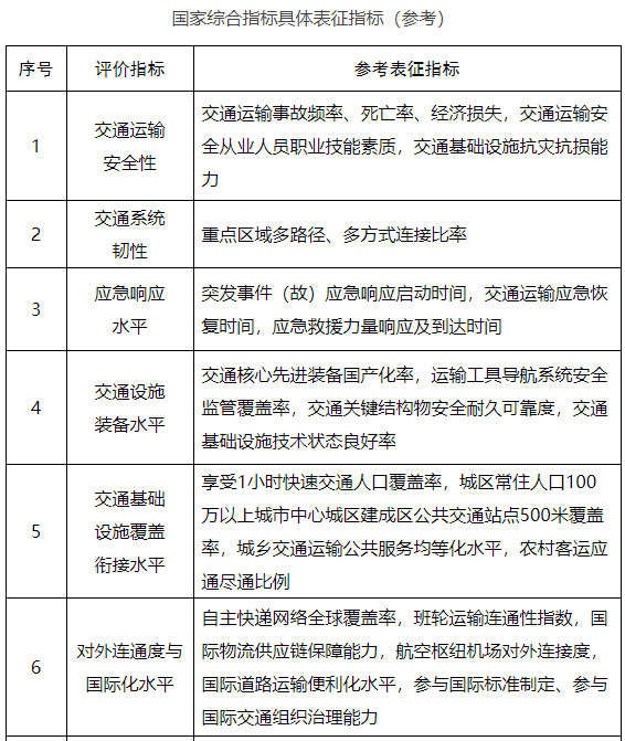 為深入貫徹落實《交通強國建設綱要》《國家綜合立體交通網(wǎng)規(guī)劃綱要》,客觀評估交通強國建設進程,充分發(fā)揮評價指標體系的“標尺”和“指揮棒”作用,科學引導各地區(qū)、各行業(yè)加快建設交通強國,我們研究制定了《交通強國建設評價指標體系》,經(jīng)報國務院領導同志同意,現(xiàn)予印發(fā)。