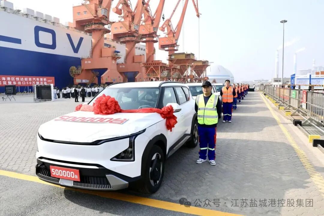 11月15日,在鹽城港濱海港區(qū)滾裝碼頭,隨著2000輛悅達(dá)起亞整車平穩(wěn)駛?cè)霛L裝船,該品牌在中國整車出口正式突破50萬輛大關(guān),鹽城汽車出口業(yè)務(wù)邁上全新臺階。