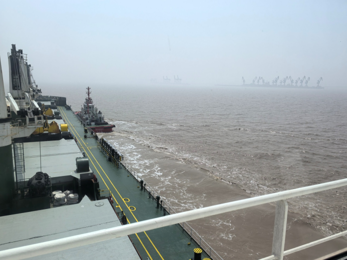 登輪后,引航員迅速通報(bào)能見度態(tài)勢,立即啟動(dòng)應(yīng)急處置流程。指令船舶開啟自動(dòng)霧號(hào)、強(qiáng)化雷達(dá)值守精度、增派專職瞭望人員、播發(fā)航行警報(bào),全程嚴(yán)密監(jiān)測周邊通航環(huán)境。依托豐富的大型船舶引航經(jīng)驗(yàn),引航員精準(zhǔn)捕捉短暫的能見度“窗口期”,沉著應(yīng)對(duì)西南風(fēng)5級(jí)、湍急水流及船舶大吃水等多重考驗(yàn),精準(zhǔn)操控船舶轉(zhuǎn)向、調(diào)速,確保航行軌跡始終可控。