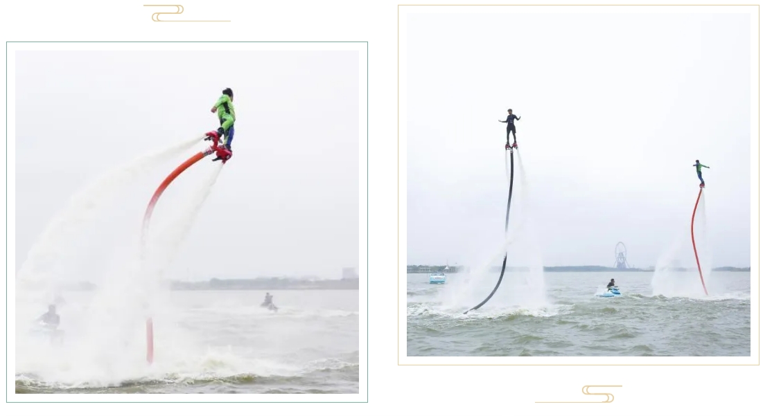 水上飛人表演區(qū)域歡呼聲此起彼伏。兩位表演者腳踩噴水裝置,宛如靈動的飛鳥,在空中做出各種高難度動作,時(shí)而翻轉(zhuǎn),時(shí)而盤旋,與日月湖的美景融為一體,構(gòu)成了一幅如夢如幻的畫面。小朋友們瞪大了眼睛,滿臉驚嘆,紛紛拉著父母的手,表達(dá)著想要嘗試的愿望。