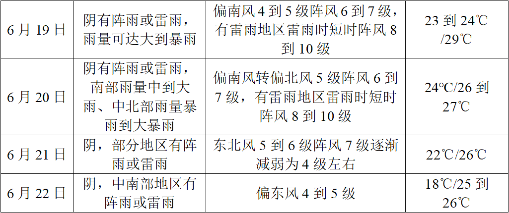 19-22日過程雨量:80~150毫米,局部180~220毫米,雨量主要集中在19-20日,21日雨帶逐漸南壓,22日降水主要在中南部地區(qū)。降雨期間局地可能伴有雷電、小時雨強40~70毫米的短時強降水和8~10級雷暴大風等強對流天氣。