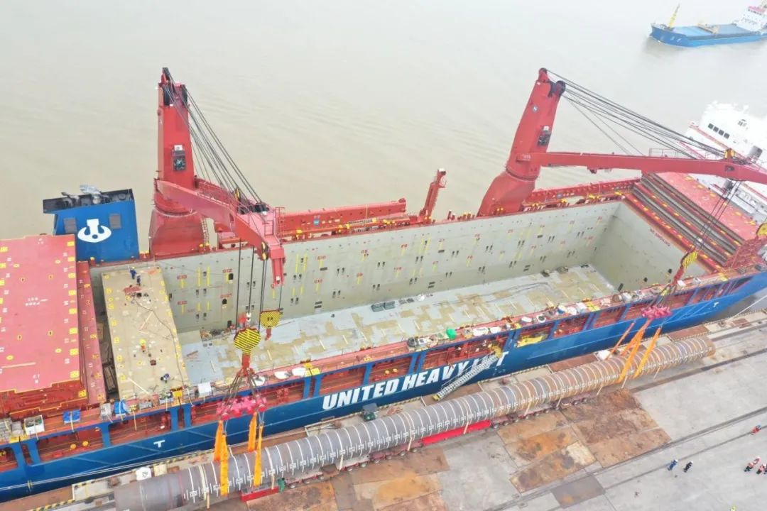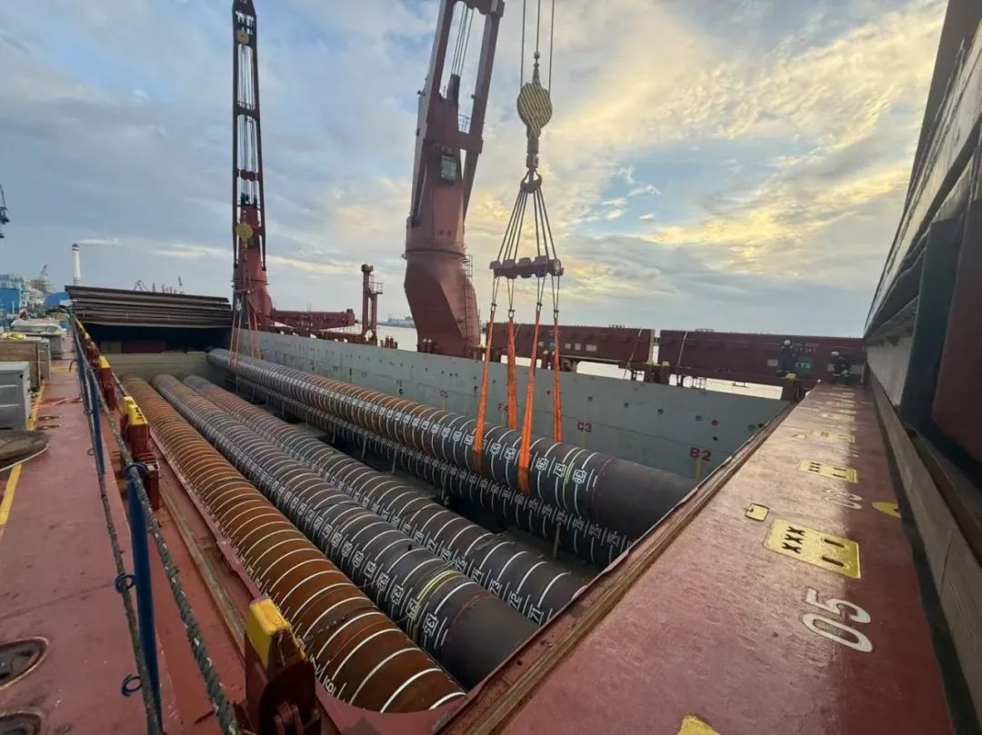 “幸福號”貨輪承載著江蘇天能海洋重工有限公司精心制造的尖端管樁裝備,這些“大國重器”將遠赴中東,為當(dāng)?shù)赜蜌赓Y源開發(fā)提供關(guān)鍵基礎(chǔ)設(shè)施支持。全船共裝載45件管樁及配套鋼結(jié)構(gòu),其中管樁長度普遍超過40米,最長達76.8米,單件最大重量突破377噸,堪稱“海上鋼鐵巨龍”。