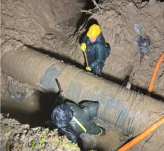 現(xiàn)場指揮與技術(shù)人員冒雨研討,迅速優(yōu)化施工方案,確保各環(huán)節(jié)無縫銜接。挖機轟鳴聲中,搶修隊員跳進齊膝深的泥漿中,摸索著查找漏點;暴雨如注的深夜里,照明燈下一個個躬身忙碌的身影,成了雨幕中最堅實的剪影。從傍晚到深夜,從大雨滂沱到雨勢漸歇,8個小時的連續(xù)奮戰(zhàn),他們未曾合眼、未曾停歇。