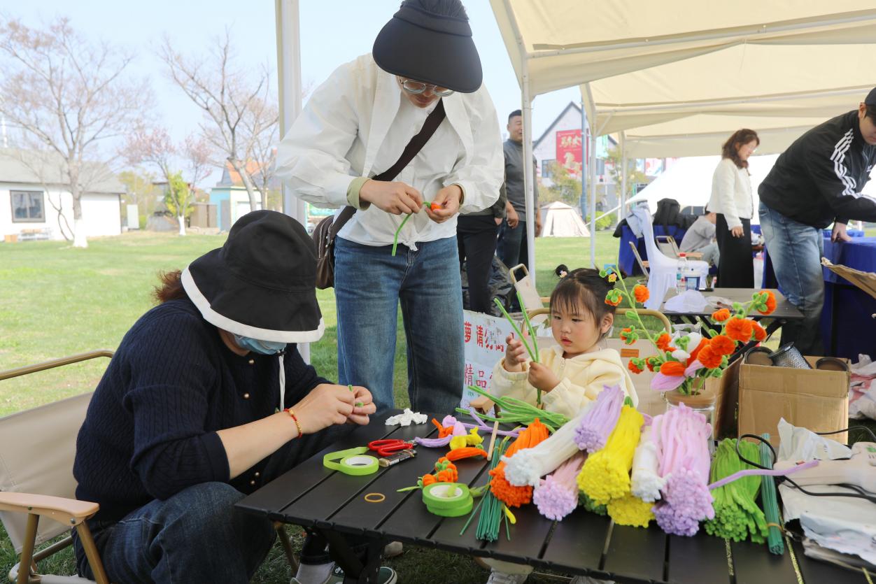 在“萌寵樂園”互動區(qū),溫順的小雞、小兔成為孩子們的新朋友,小朋友們體驗趣味喂養(yǎng),與萌寵親密合影。一旁的手工綠植小盆景制作區(qū),親子共同動手栽種綠植、搭配裝飾,將一抹春意帶回家。非遺絨花編織區(qū)則吸引了不少家庭駐足,在專人教學下,一根根絲線化作精美的春日絨花飾品,讓孩子們在動手過程中感受傳統(tǒng)手工藝的魅力。