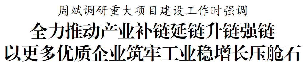 周斌在調研中強調,重大項目是撐起我市經濟社會發(fā)展的“硬脊梁”。各地各部門要切實增強責任感緊迫感,牢固樹立“項目為王”理念,圍繞“5+2”戰(zhàn)略性新興產業(yè)和23條重點產業(yè)鏈,持續(xù)掀起招商引資和項目推進熱潮,夯實高質量發(fā)展的根基。圍繞推進新型工業(yè)化與新質生產力良性互動,搶抓大規(guī)模設備更新等機遇,推動制造業(yè)技術改造升級,實現(xiàn)高端化、智能化、綠色化發(fā)展,大力構建現(xiàn)代化產業(yè)體系。要做好為企服務,擦亮“鹽誠辦”金字招牌,抓好企業(yè)發(fā)展“三件事”,助力企業(yè)各展所長、深化合作,全面激發(fā)發(fā)展的內生動力和活力。