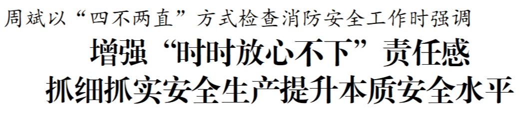 6月27日下午,市委書記周斌以“四不兩直”方式檢查消防安全工作。他強調,要深入學習貫徹習近平總書記關于安全生產和消防工作的重要論述,按照省市委部署要求,時刻繃緊安全生產這根弦,增強“時時放心不下”的責任感和“事事心中有底”的行動力,抓實抓細隱患排查整治,壓緊壓實各方責任,全面筑牢安全防線,切實維護人民群眾生命財產安全。