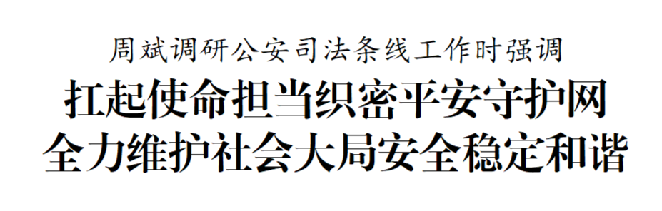 在調(diào)研中,周斌指出,公安司法條線(xiàn)是維護(hù)社會(huì)穩(wěn)定的“主力軍”、服務(wù)高質(zhì)量發(fā)展的“護(hù)航員”。要突出政治引領(lǐng),服務(wù)發(fā)展大局,圍繞優(yōu)化營(yíng)商環(huán)境、護(hù)航產(chǎn)業(yè)發(fā)展、保障民生福祉等中心任務(wù),找準(zhǔn)工作切入點(diǎn)和發(fā)力點(diǎn),為高質(zhì)量發(fā)展提供堅(jiān)強(qiáng)法治保障。要深化社會(huì)治理,堅(jiān)持和發(fā)展新時(shí)代“楓橋經(jīng)驗(yàn)”,完善網(wǎng)格化管理、精細(xì)化服務(wù)、信息化支撐的基層治理平臺(tái),提升社會(huì)治理現(xiàn)代化水平。要堅(jiān)守人民立場(chǎng),聚焦群眾“急難愁盼”,扎實(shí)推進(jìn)平安建設(shè)、掃黑除惡、未成年人保護(hù)等工作,不斷增強(qiáng)人民群眾的獲得感、幸福感、安全感。